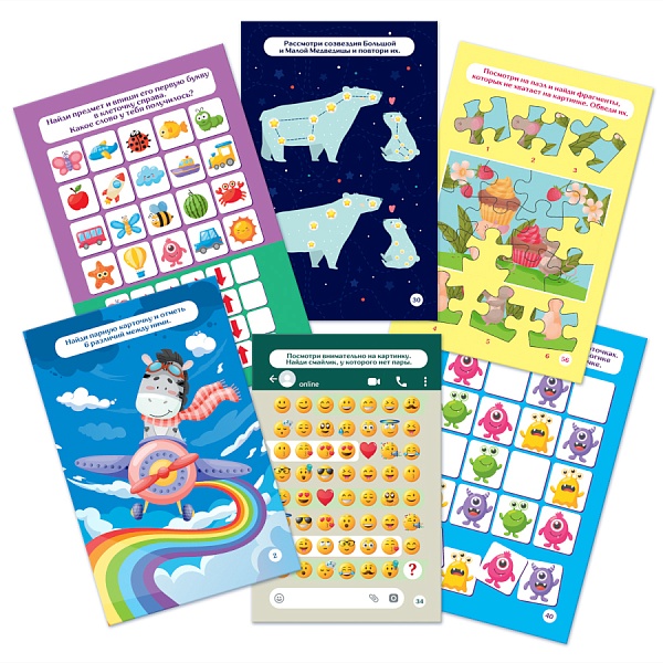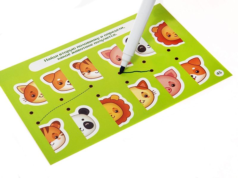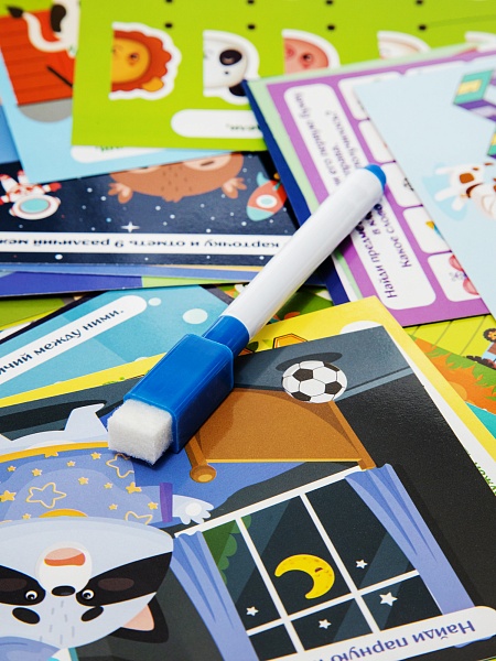 Соединяйте точки, ищите недостающие детали, отмечайте различия и выполняйте задания. Переходите от простых задач к более сложным. Не бойтесь ошибаться – маркер на водной основе легко стирается обычной салфеткой.
