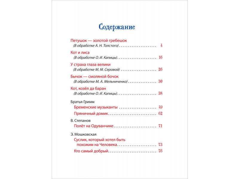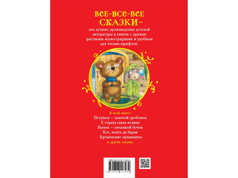 «ВСЕ-ВСЕ-ВСЕ СКАЗКИ» — это лучшие произведения детской литературы в книгах с яркими цветными иллюстрациями и удобным для чтения шрифтом. В этой книге: "Петушок — золотой гребешок"; "У страха глаза велики"; "Бычок — смоляной бочок"; "Кот, козёл да баран"; "Бременские музыканты" и другие сказки.