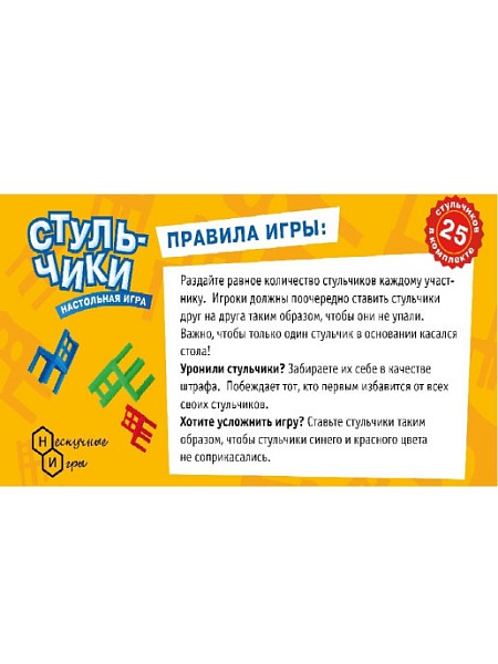 Цель данной игры заключается в том, что необходимо собрать пирамиду из комплекта стульчиков, внимательно следя, чтобы конструкция не рухнула.