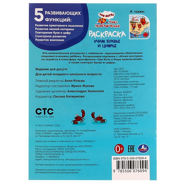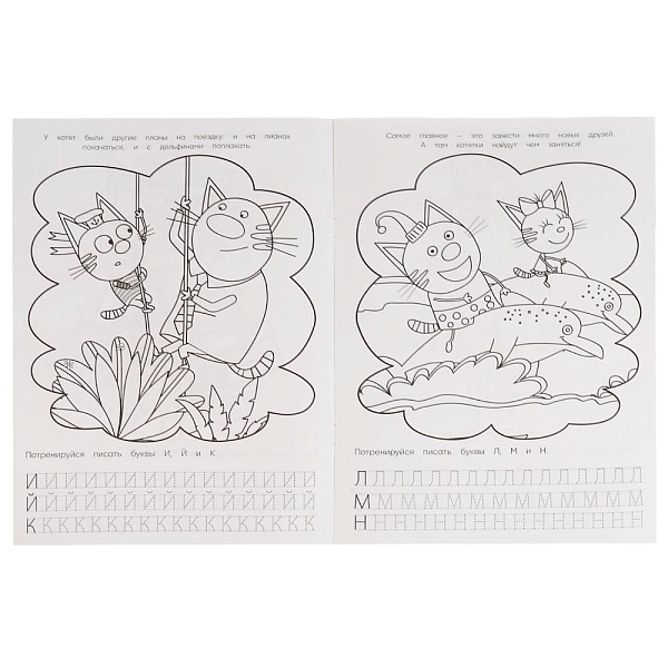 Раскраска «Три кота и море приключений. Учим буквы и цифры» ТМ «УМка» станет отличным подарком для юных художников: