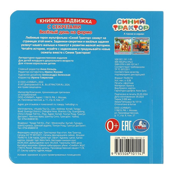 Весёлый день на ферме. СИНИЙ ТРАКТОР (книжка-задвижка с тригерами) 160х160мм 8стр 405730