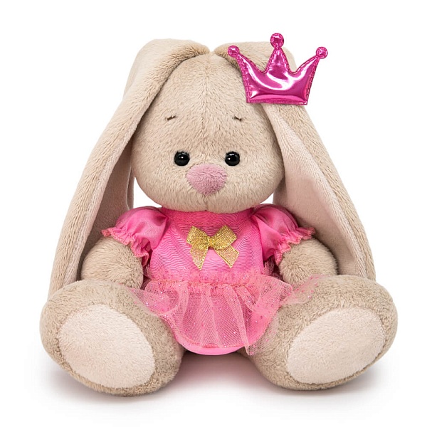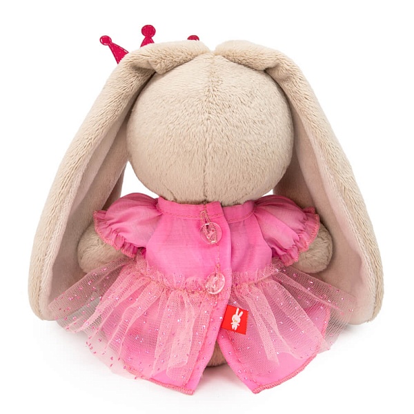 Малышка Зайка Ми принцесса в розовом платье. Платье из тонкой ткани, с рукавом фонарик и верхней оборкой по низу из розовой сеточки с золотистыми вкраплениями. Спереди платье украшает золотистый бантик. На голове у малышки Зайки Ми блестящая корона цвета фуксии.