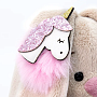 На ушке у Зайки необычный аксессуар единорог на подкладке из розового меха и украшенный пайетками и глитером.