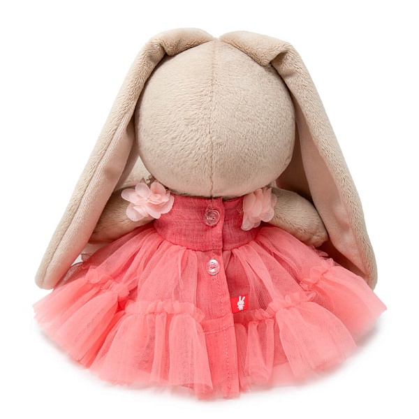 Зайка в пышном платье без рукавов, сшитом из нескольких слоев тончайшей сеточки кораллового цвета.