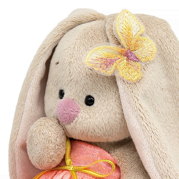 Зайка в необычном сарафанчике из интересной ткани цвета крема с блеском. Спереди сарафанчик украшен желтым бантиком с золотистым краем. На ушке у Зайки милая вышивка на сеточке в виде бабочки.