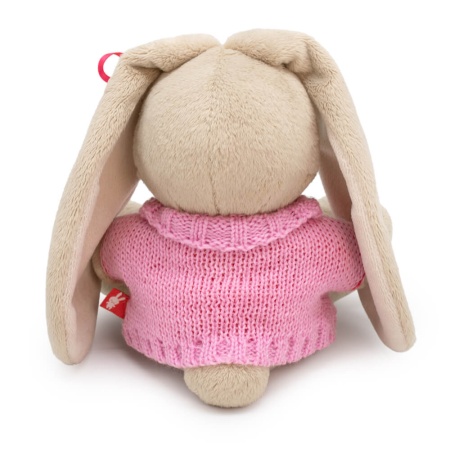 Малышка Зайка Ми в удлиненном свитере с высоким горлом. Свитер связан из нежного акрила цвета розовой герани, на груди вывязано сердечко из ярко‑розовой пряжи. На ушке у Зайки ярко‑розовый атласный бантик.