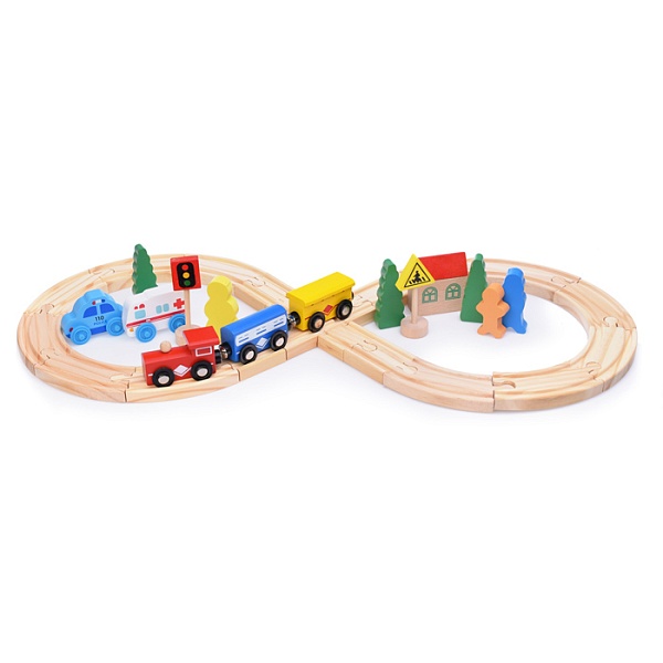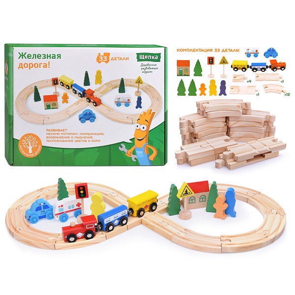 Яркий деревянный железнодорожный набор для весёлых игр и развития воображения! Паровоз с магнитными вагонами ездит по красочному треку, а вокруг можно расставить домики, машинки, дорожные знаки и фигурки жителей. Прочные материалы и удобные соединения делают игру безопасной и увлекательной.