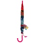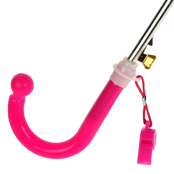 Зонт-трость легко раскрывается при нажатии на кнопку, складывается вручную. Рукоять имеет удобную форму, а каркас выполнен из облегчённых материалов, поэтому держать зонт ребёнку не составит особого труда. В целях безопасности концы спиц, наконечник зонтика, ручка и фиксатор выполнены из пластмассы и не травмоопасны. К рукояти зонта прикреплён свисток, который можно использовать в экстренной ситуации для подачи сигнала или просто для игры.